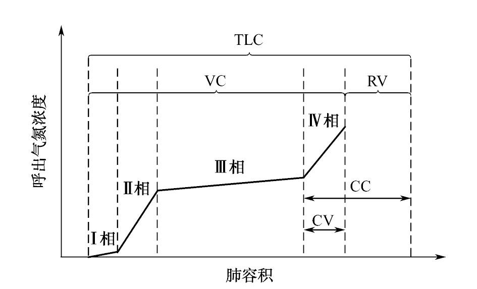 氮?dú)夥ǎㄒ砸豢跉獾獪y定法(single breath nitrogen test,SBN2)為例):被檢查者取坐位或立位,先平靜呼吸數(shù)次,再深呼氣至殘氣容積位,接著令被檢查者緩慢持續(xù)吸純氧至肺總量位,然后再緩慢均勻呼氣,一直達(dá)殘氣容積位。在緩慢呼氣過程中,肺功能記錄儀描繪呼出氣體的量與呼氣瞬時氮濃度的關(guān)系,會得到4相曲線,見圖1。Ⅰ相為氣道內(nèi)與檢查儀器的管道內(nèi)不含氮?dú)獾臒o效腔氣體,氮濃度為零;Ⅱ相為無效腔氣體與上下肺區(qū)肺泡氣體的混合,氮濃度開始上升;Ⅲ相為上下肺區(qū)同時排出氣體,氮濃度相對穩(wěn)定;Ⅳ相為下肺區(qū)小氣道開始閉合停止排氣,并逐漸向上肺區(qū)推進(jìn),含氮較高的上肺區(qū)肺泡氣體繼續(xù)呼出時,氮濃度明顯上升,第Ⅲ、Ⅳ相交點(diǎn)至深呼完氣即閉合容積。重復(fù)上述檢查2~3次,每次間隔時間5~10分鐘。
